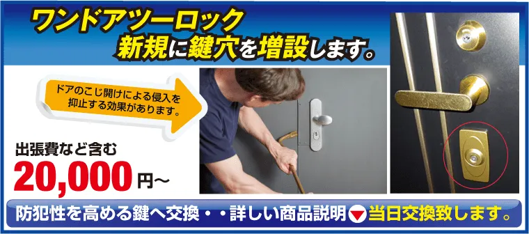 現在、玄関ドアに鍵穴が1ヶ所しか付いていない場合に、新規に鍵穴の増設を行ったり補助錠を追加取り付けすることでワンドアーツーロック【*1】として防犯性を高める事ができます。